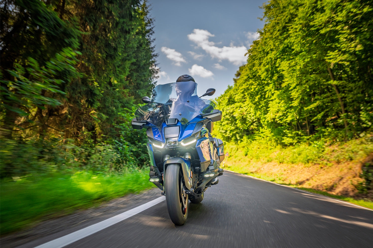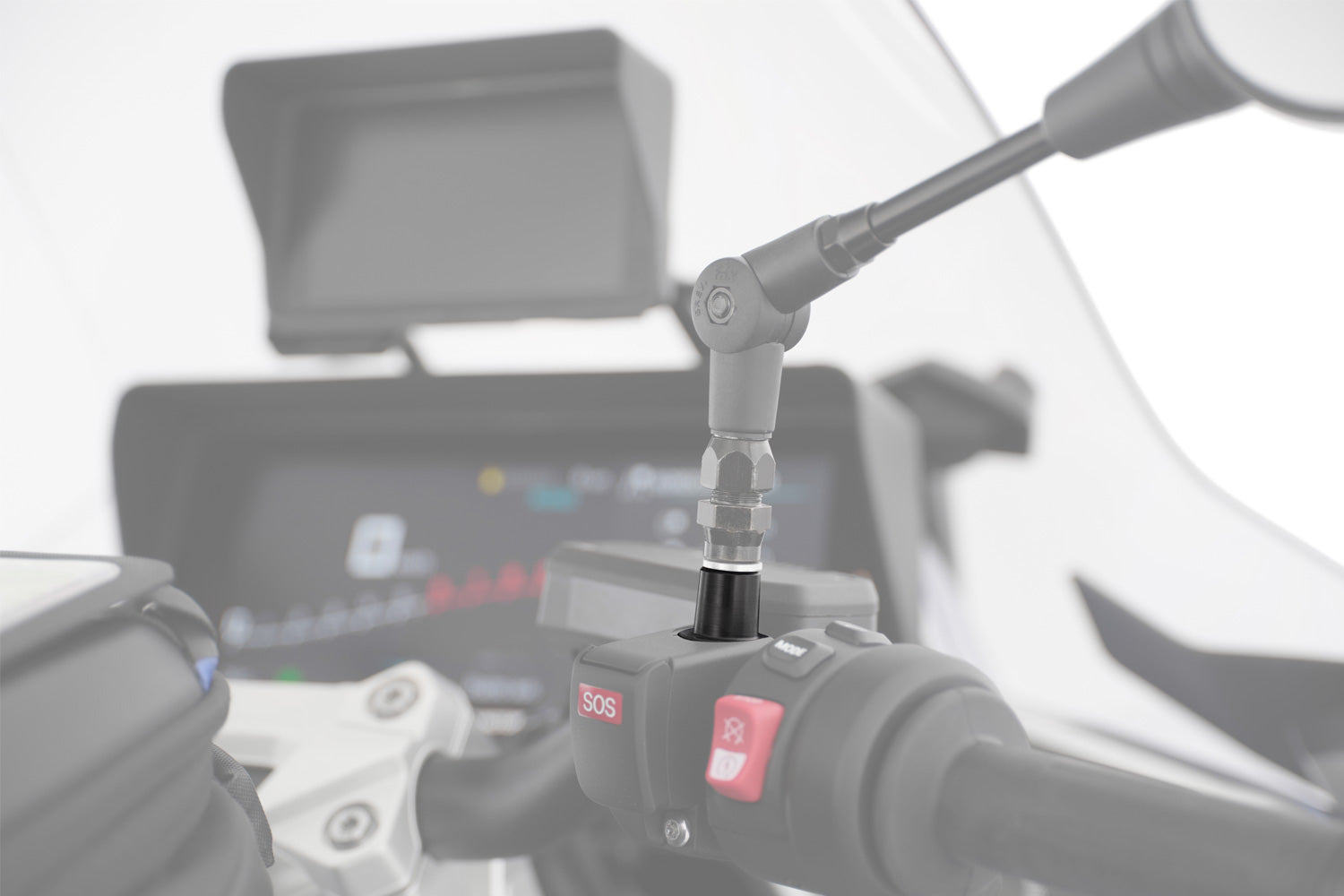 The additional mirror mount allows for the installation of two extra mirrors to complement the original rear-view mirrors, which are positioned low in the fairing. Ergonomically, placing mirrors at natural eye level is optimal because it enables easy and intuitive observation of traffic behind without having to deliberately lower your gaze. These mounts make it possible to position the mirrors in a way that noticeably improves the rearward field of vision, thereby enhancing active riding safety. Both sets of mirrors complement each other perfectly to provide outstanding awareness of everything happening behind the motorcycle. The mounts allow the original controls – which are not equipped with mirror holders as standard – to be modified so that additional rear-view mirrors can be mounted in conjunction with the SOS button and auxiliary light switch.
