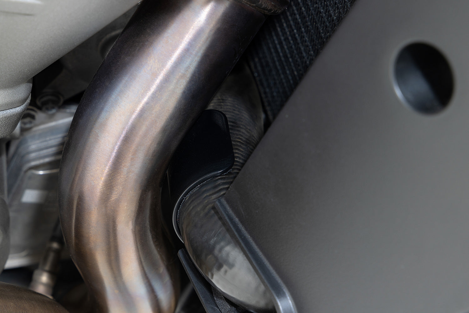 The heat shield plate comes with an insulating heat protection wrap and is simply screwed down to the bracket which also attaches to the radiator. The shield plate fully encloses the hose on the side facing the manifold. The metal is heat-reflecting, which boosts the insulating effect of the heat protection wrap.