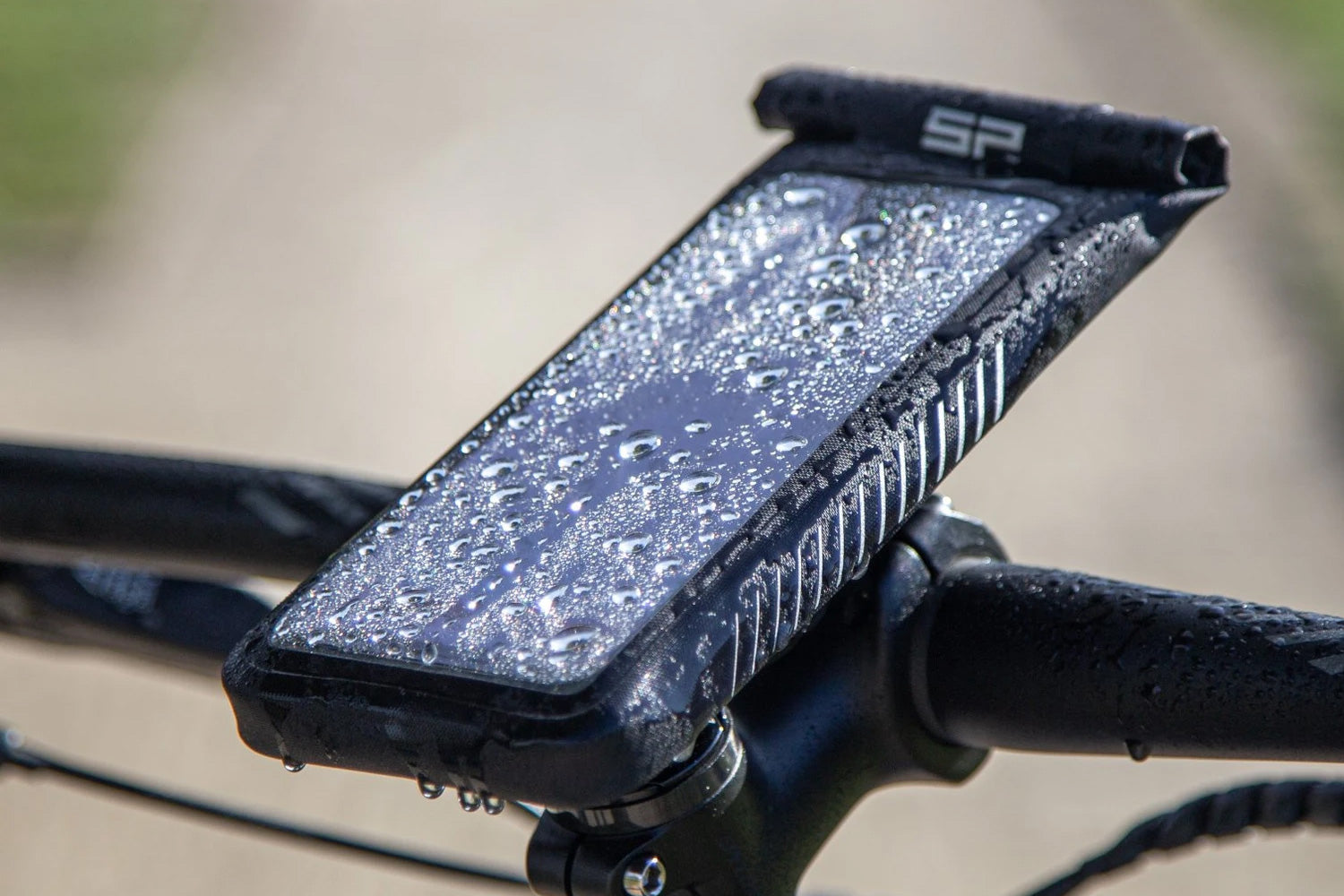 With the SP Connect universal smartphone protection cover you can attach almost any smartphone to any SP Connect bracket you want, letting you safely attach your smartphone to motorcycles as well as bicycles, cars, etc. using the patented screw top mechanism. Simply slide the phone into the cover, curl up the opening and attach using the adhesive surface. This protects your smartphone from the rain, mud and dust while maintaining full touchscreen operability.