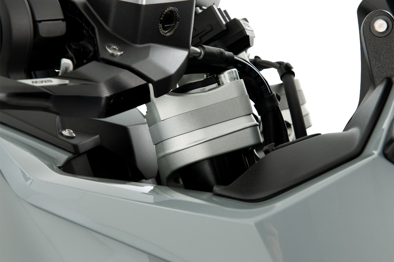 The handlebar riser specially developed by our engineers raises the clip-on handlebars by 15 millimetres. The height is optimally tuned for sporty use. The ergonomic effects are significant, as they relax the entire back muscles and arms while relieving the spine, pelvis and coccyx. This significantly improves comfort and noticeably reduces fatigue on long journeys. Overall, the handlebar riser supports a sporty, relaxed and intuitive riding style that contributes to greater active riding safety, as well as better visibility of traffic thanks to the more upright seating position.